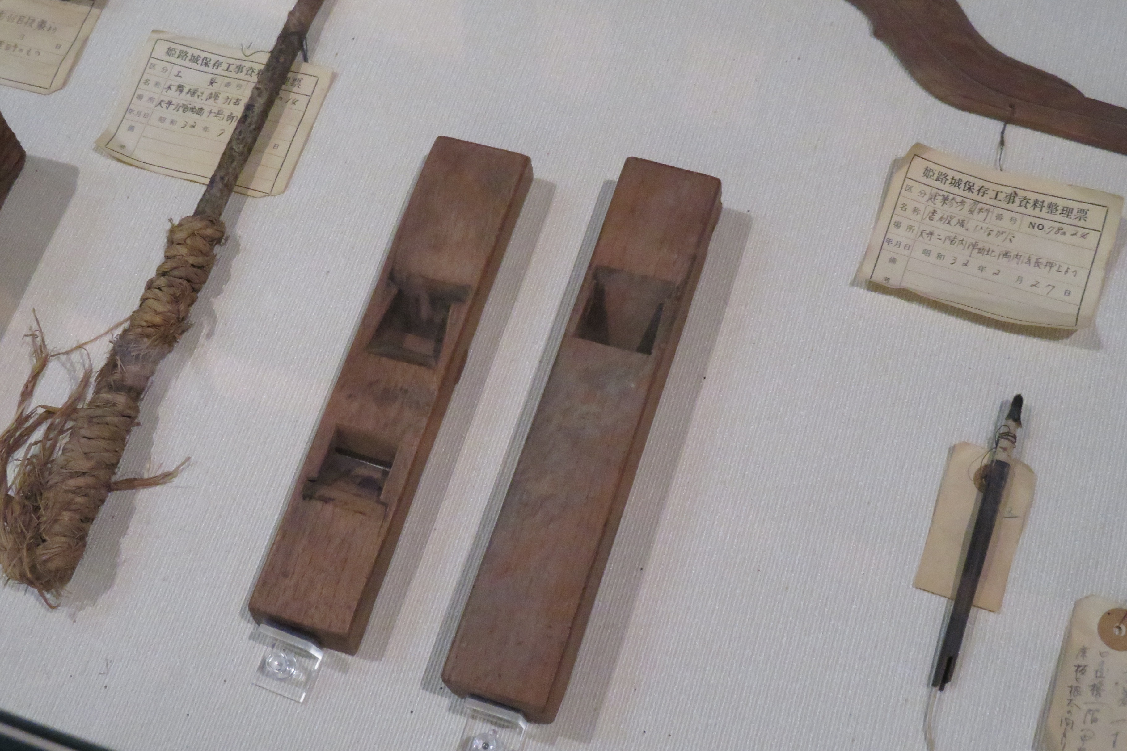 大修理で発見された台鉋などの大工道具は、その一部が兵庫県立歴史博物館の1階で展示されています (写真3)。1階は無料見学エリアなので、興味のある人はぜひ見学してください。