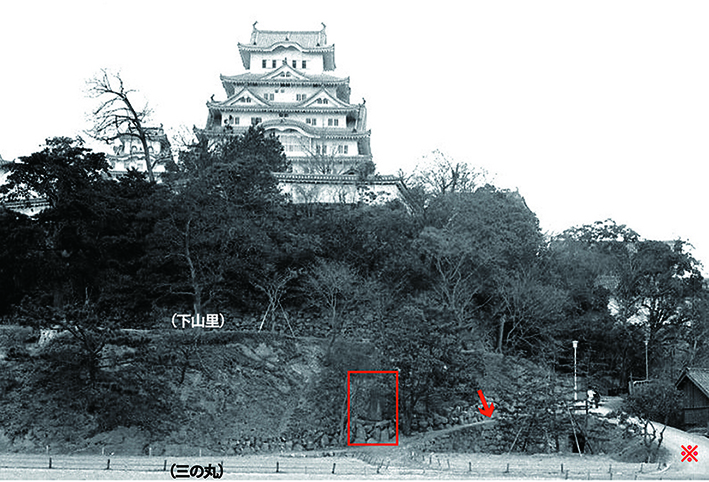 その通路敷として、本来は内堀が姫山の東側斜面に切込んだ堀留に、その斜面を利用して平坦面を造り出しました (図1)。