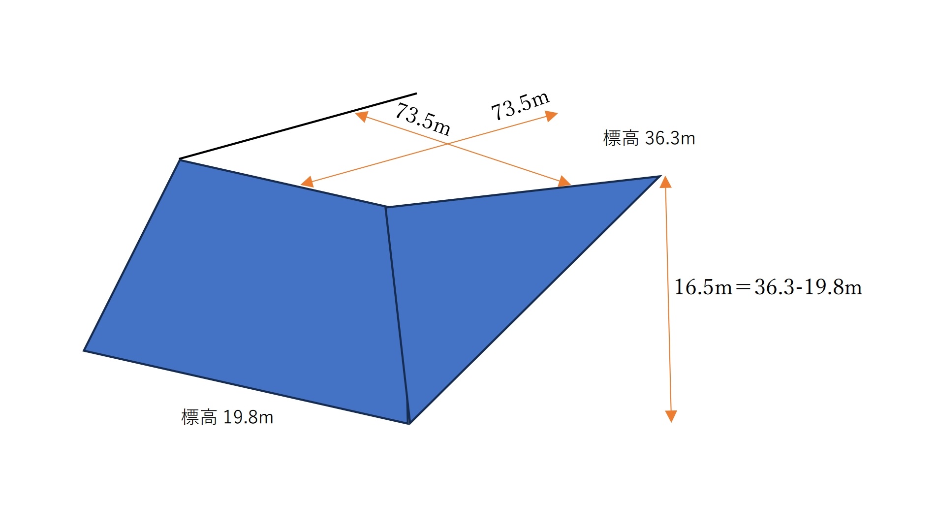 姫路城の特徴の一つは、城の中核部分を2つの峰を利用して造成している点です。天守群は姫山、西の丸は鷺山の独立丘を利用してそれぞれ築かれました。西の丸増築では、まず鷺山の頂部付近を掘削し (写真1)、その排出土で南斜面を埋めて広い曲輪面積を造成しました (写真2)。このときの工事量を試算するために、掘削した土砂で埋め立てた範囲を模式的に図示しました (図1)。これをもとに土量を計算すると、