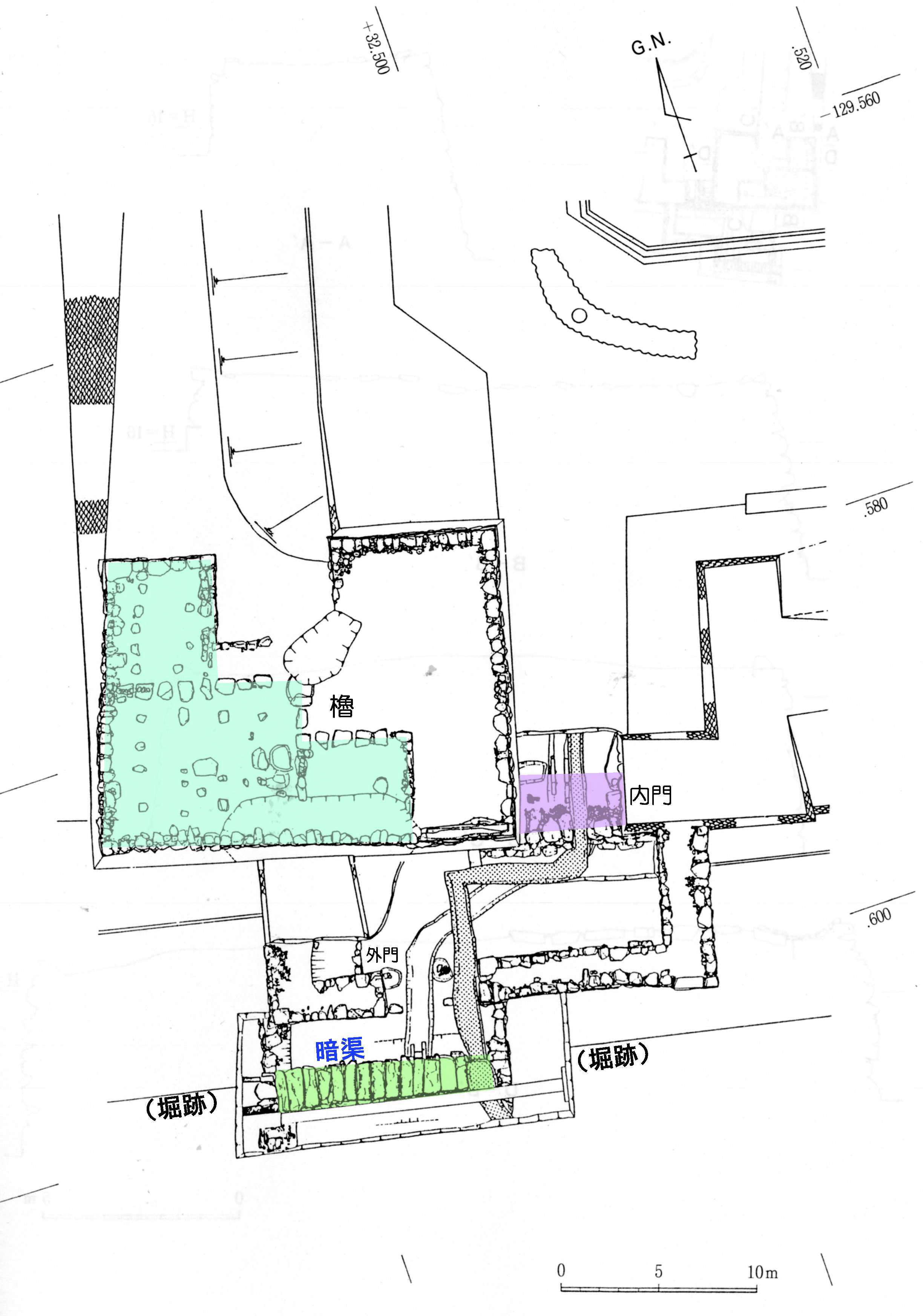 では、土橋が無ければ水が溜まらないのはなぜなのでしょうか。それは堀に勾配があるため、自然に流下するからです。ある程度の水深を必要とする堀では、水が溜まってもらわないと困ります。江戸初期の中堀沿いの町屋域の正確な地形は不明ですが、大正年間の南部外堀堀底と現在の標高から、全体的に惣社門あたりから西に向かって低くなっていたことが想定できます。また、綿 (わた)町中央の↓のところに「御用水」と呼ばれた中堀から南部外堀への南北の水路 (現在はおみぞ〈小溝〉筋商店街)があったことから、惣社門と中ノ門の間では中央部が低くなっていたとみられます。こうした高低差を考慮して、城門の土橋に堰としての機能を持たせたのでしょう。その証左として図2を挙げておきます。この図は埋門跡の調査平面図で、薄緑の部分が土橋跡から出土した石組暗渠です。つまり、暗渠底面の高さまで水が溜まり、それ以上溜まるとオーバーフロー した堀水が暗渠を通って西側に流下しました。