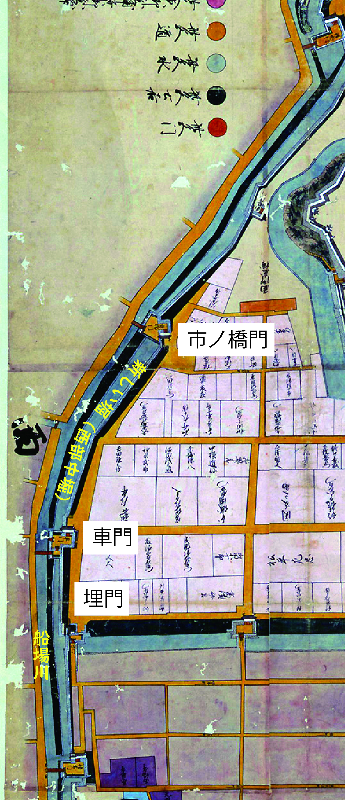 こうした埋門の築造は、城の西を流れる船場川の改修とリンクするものでした。池田時代、城の西に接して妹背川が流れていました。これは城を守る堀の役割もあったのでしょう。その妹背川を城と飾磨津を結ぶ船路に改修したのが本多忠政で、以来、船場川と言われようになりました。改修では、川と城石垣の間に新たに堀を設け、川の流水が直接石垣を洗うことがないようになりました。また、新しい堀は川よりも少し水位が高く、車門や市ノ橋門も外枡形にして、枡形の石垣が堰となり水を溜めることができるようになり(図3と写真1の手前の石垣)、この結果、城の西側は二重堀となりました。写真1と2は船場川沿いの現況ですが、堀・川の改修と長大な石垣の存在から、忠政が姫路城西側の防御にいかに腐心したかを感じられるでしょう。