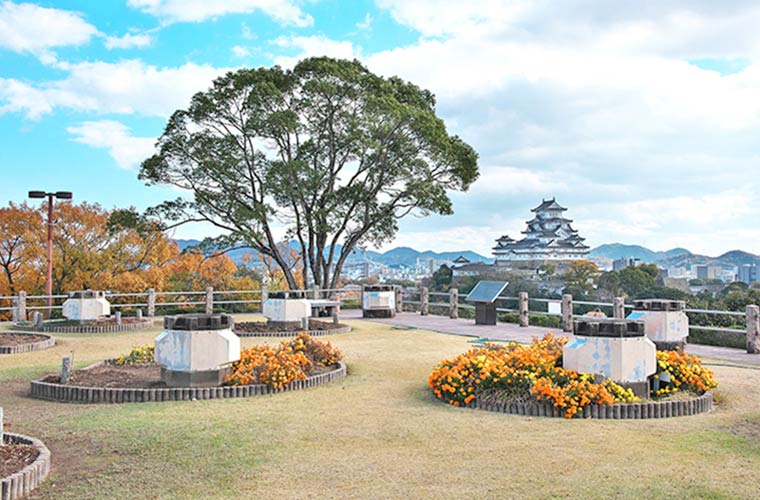 北へ5分ほど歩いたところにある「城見台公園」で、姫路城&シャチホコと一緒に撮影するのもおすすめ!SNSに投稿したら、いいね!が増えるかも♪