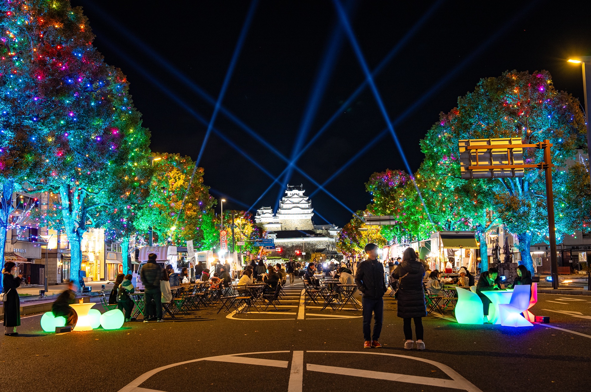石井幹子氏監修のもと「あたら夜 (明けるのが惜しいほど美しい夜)」をテーマに、大手前通りを約25万球のフルカラーLEDを用いて、時間ごとに色・動きがさまざまに変化するイルミネーション演出を行います。さらに、姫路城の彩雲ライトアップと連動した統一感のある演出も。クリスマス・正月等の期間には特別カラー演出も楽しめます。