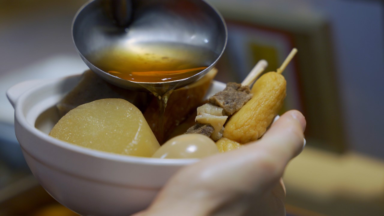 姫路では、おでんを生姜醤油で食べます。生姜醤油で食べるおでんはごく限られた地域の食べ方で、2006年6月姫路の食でまちおこしを行うグループが「姫路おでん」と命名しました。(地元姫路では一般的な食べ方だったため、それまでは特に名前はありませんでした。)また、食べ方の起源については諸説があるのですが、昭和初期に姫路の浜手地域で甘辛い関東煮(かんとうだき)に生姜醤油をかけて味を調整して食べたのが始まりではないかと言われています。元々は、関東煮のダシを切って生姜醤油を上からかけていたのですが、その後関西風の薄味(飲めるダシ)のおでんの登場とともに、刺身のように小皿に入れた生姜醤油につけて食べる方も多くなってきました。今では、おでん専門店だけではなく、様々なジャンルの飲食店で提供されています。