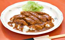 ご飯の上に叩いて平たくしたビーフカツをのせ、デミグラスソース系のたれをかけたものを洋皿に盛り、お箸で食べます。かつめしはそれぞれの店に、それぞれのレシピのある料理です。