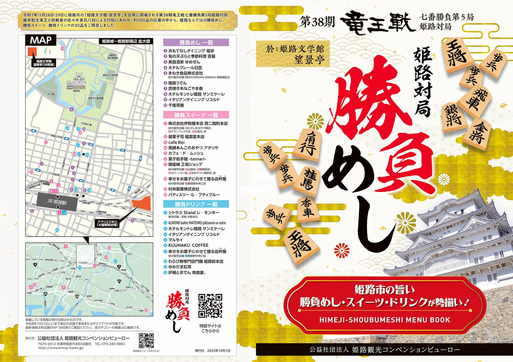 令和7年11月28日(金)・29日(土)に姫路市の「姫路文学館・望景亭」を会場に開催される第38期竜王戦七番勝負第5局に関連し、姫路ならではの勝負めし、勝負スイーツ、勝負ドリンクを掲載するメニューブック「HIMEJI-SHOUBUMESHI MENU BOOK」が完成しました。