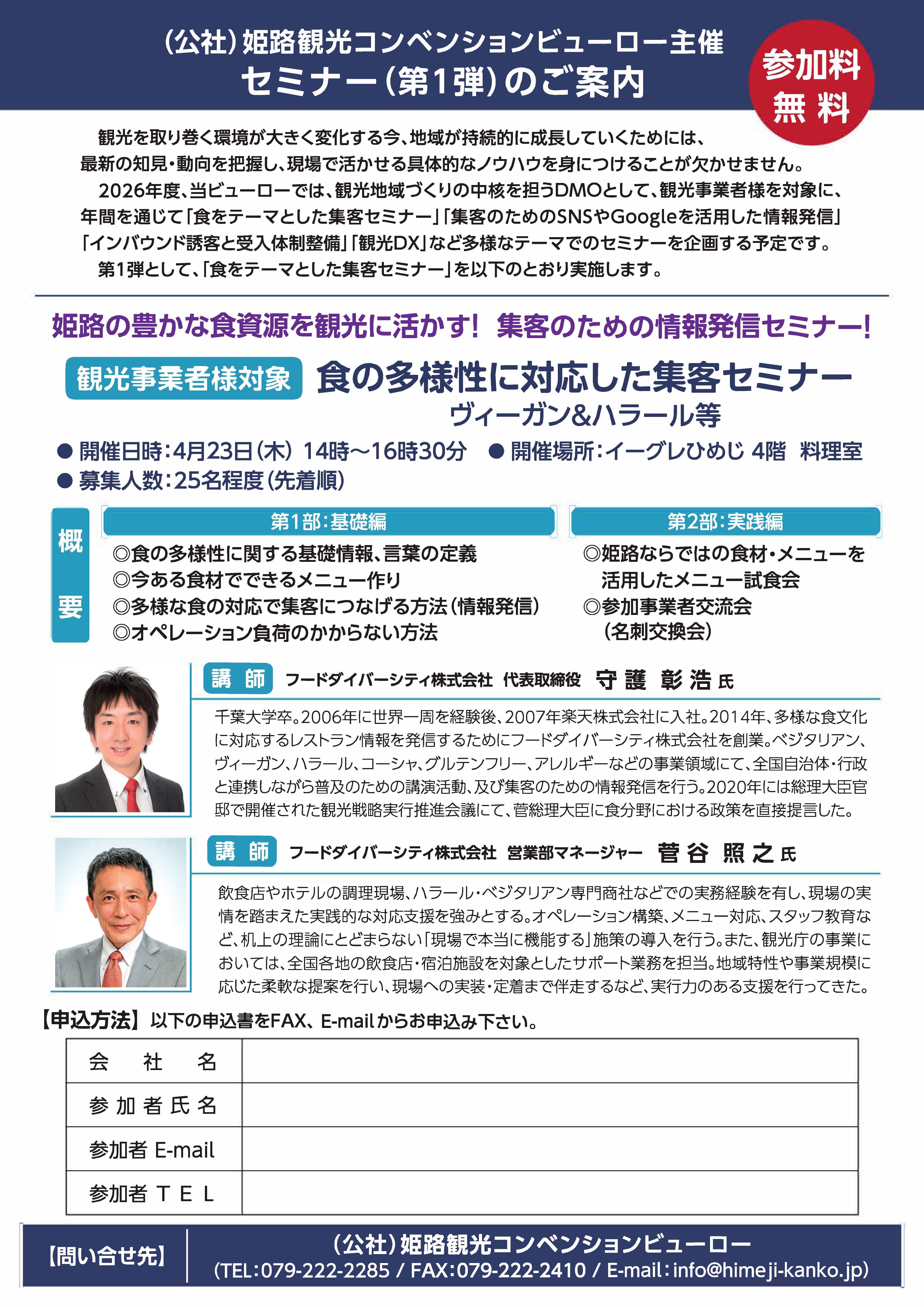 公益法人姫路観光コンベンションビューロー主催の「セミナー(第1弾)」のご案内です。