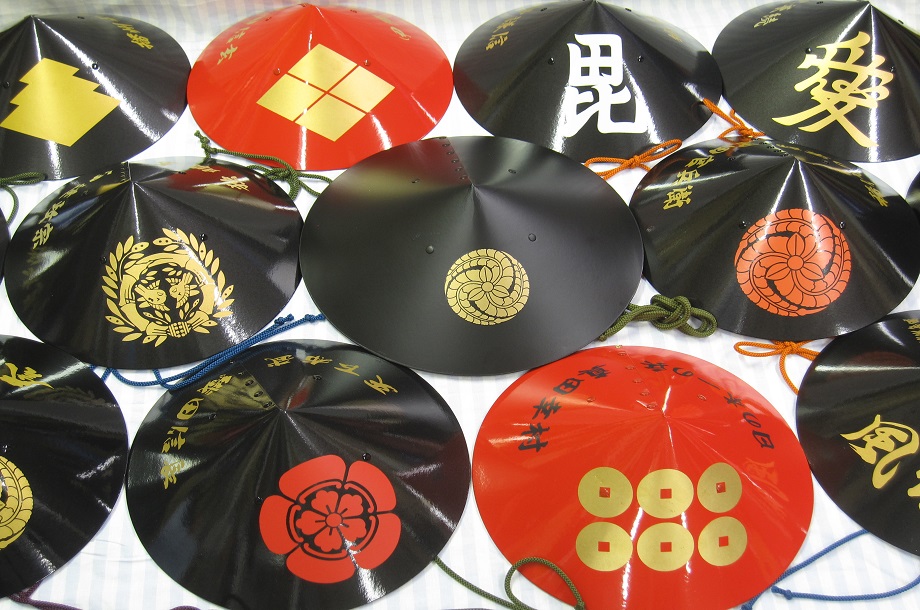 真田幸村・織田信長・武田信玄・上杉謙信・黒田官兵衛など、戦国有名武将をイメージした陣笠を20数種制作しております。