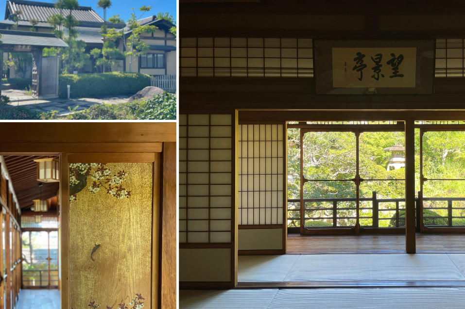 登録有形文化財である望景亭は、唐破風の玄関や茶室、庭園を望む和室、四季を描いた板戸絵など、細部にまで日本建築の美が息づく名建築。