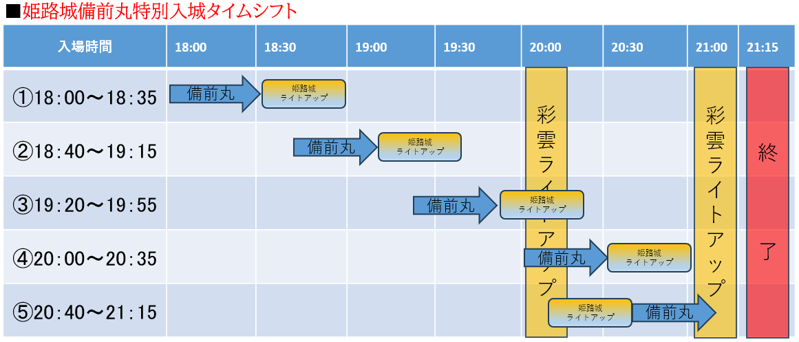 18:00~21:15 ※下記の姫路城備前丸特別入城タイムシフトの①~⑤から選択可能)