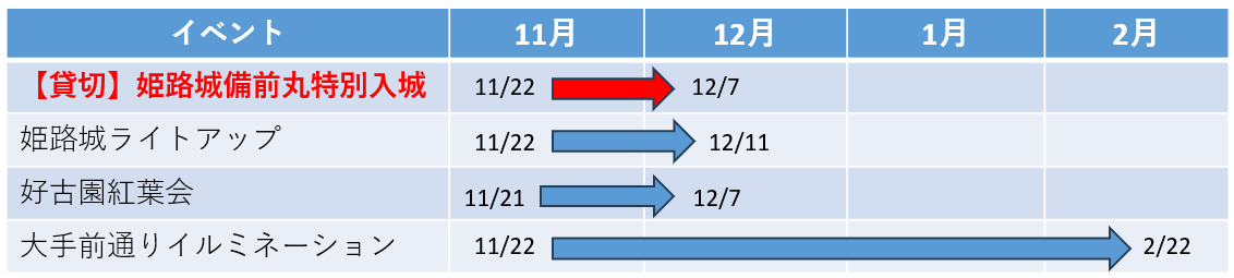 11月22(土)から12月7日(日) ※夜間イベントと「姫路城備前丸特別入城」の期間が重なる16日間